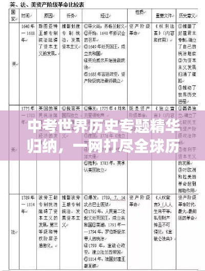 通过对以上专题的归纳和总结,我们可以更清晰地了解世界历史的发展脉络和规律,中考考生在复习世界历史时,应注重掌握各个时期的重要事件、人物和思想,理解历史发展的因果关系,提高历史分析和解决问题的能力,也要关注历史与现实之间的联系,以史为鉴,更好地认识和理解当今世界的形成和发展。