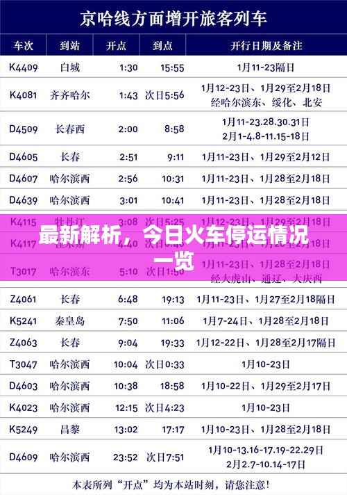 随着季节交替和天气变化,部分地区可能会出现火车停驶或调整运行时刻的情况,为了保障旅客的出行安全,铁路部门会及时发布相关通知和公告,了解最新的火车运行消息对于旅客来说至关重要。