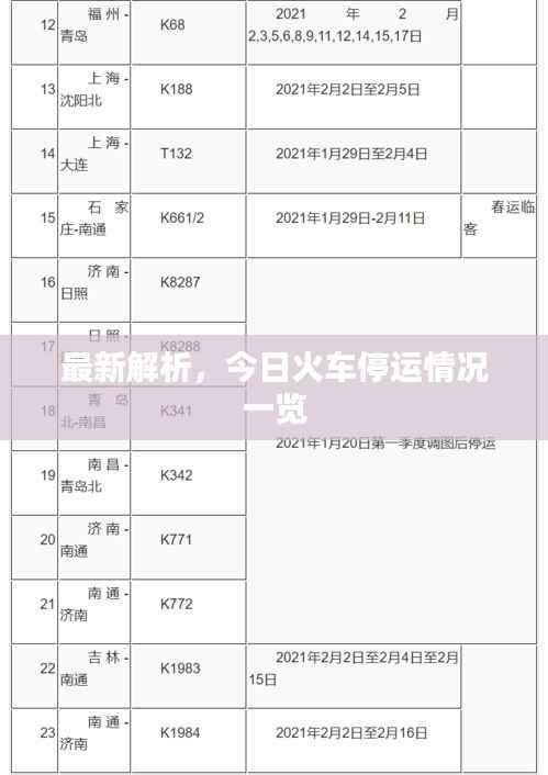 了解最新的火车运行消息对于旅客的出行至关重要,旅客应通过官方渠道获取最新的消息,并根据实际情况做好行程调整,铁路部门也应加强信息发布和提示,为旅客提供更加便捷、安全的服务,希望本文能为广大旅客提供有用的信息和建议,祝愿大家出行平安、顺利。